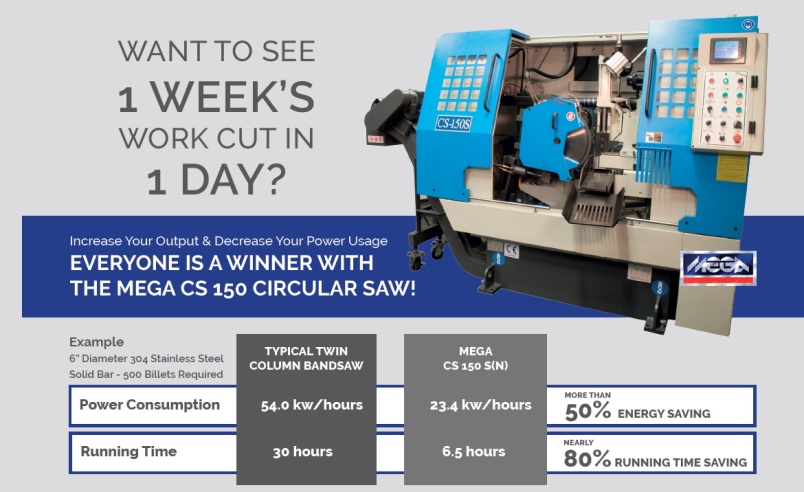 Other machines which will be under power and working during the show include the MEGA CS150S which has now been a part of the show for the past decade. The CS machine once again will be running with the CX Connection Cut Blade made by Dutch Blade Manufacturer, Kinkelder. Demonstrating why this machine continues to be the most popular carbide circular saw for harder metals, Prosaw will have a selection of materials from Aerospace Grade Stainless to Induction Hardened Chrome on hand ready to show to customers who are looking to increase throughput and reduce man hours!